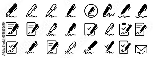 Signature icon set, pen signing contract, business management, legal document, agreement, corporate deal, business partnership, vector illustration.