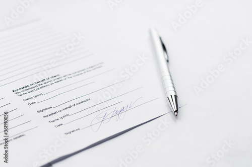 Signature under a business contract agreement with a pen. The signature is fictional.