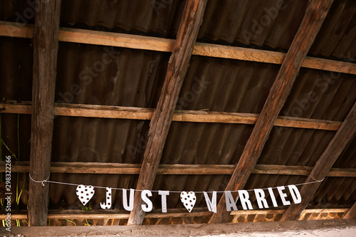 signboard just maried under loft roof. Wedding concept. Wedding in vintage style.