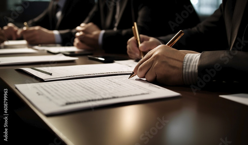 business, pen, hand, office, writing, document, businessman, people, paper, meeting, contract, woman, working, person, closeup, work, businesswoman, desk, job, computer, hand, table, paperwork, training, signing, generative, artificial intelligence