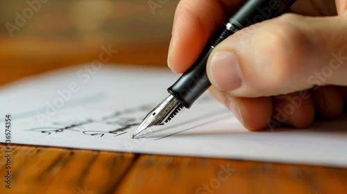 Signing lucrative business contract, close-up hand with fountain pen. Formal business contract with signatures and official documents.
