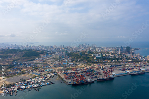 Sihanoukville, Cambodia - March 15, 2020: Ariel view of container terminal of Sihanoukville Autonomous Port.