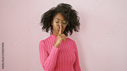 Silent african american woman gesturing hush in a pink sweater against a soft pink backdrop.