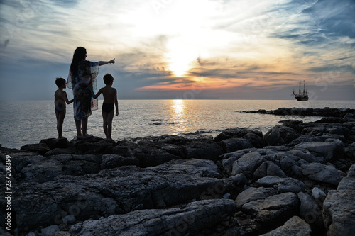 silhouette, sunset, woman, mother, children, children, son, twin, family, vacation, summer, sea, seacoast, beach, rock, rocky beach, horizon, peaceful, childhood, daydream, evening sky, picturesque, standing, pointing, showing, stare, watching, twilight, holding hands, traveling, ship