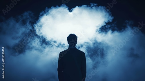 Silhouette Amidst Mysterious Blue Clouds Reflecting States of Mind and Solitude