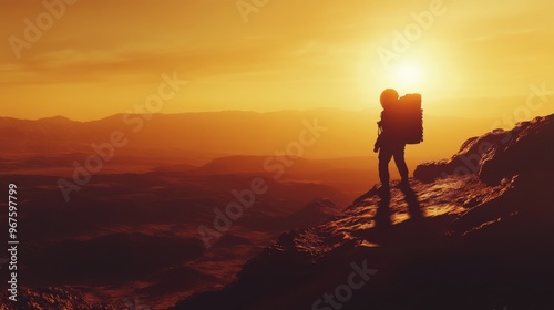 Silhouette astronaut on Mars at sunset.