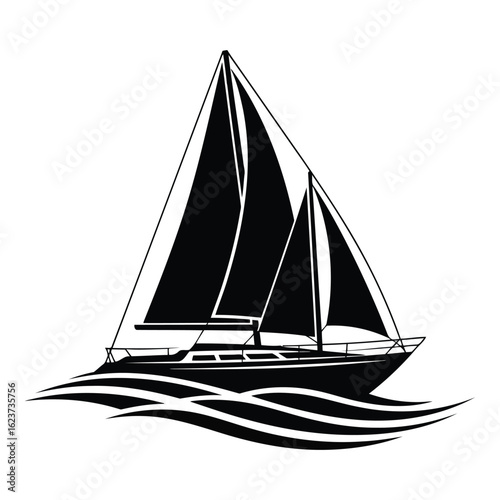 Silhouette black vector vector art of sailboat with full sails on wavy water, symbolizing adventure and travel
