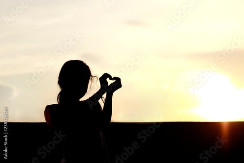 silhouette children marking love symbol with arms and hands over sunset, shadow image children in happy playing feel evening time, silhouette of child enjoy, kid joy playing silhouette feel in sunset