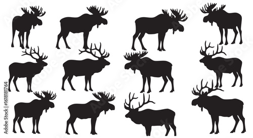 moose, cervid, elk, antler, silhouette, animal, wildlife, nature, forest, vector, illustration, graphic, design, pattern, seamless, background, template, monochrome, black-and-white, mammal, reindeer, stag, isolated, timberland, wild, creative