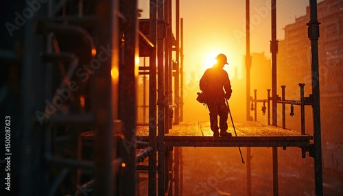 Silhouette construction worker on scaffold platform in rain at sunset. Hardworking man with helmet, standing on construction site. Dusk dramatic sky with golden light, heavy rain drops, industrial