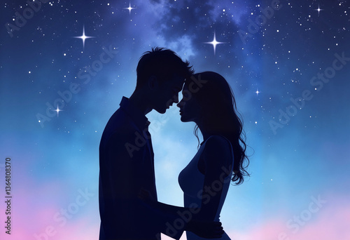 silhouette, couple, embracing, starry, night, love, romance, intimacy, sky, star, two people, man, woman, emotional, connection, cosmos, dark, blue, gentle, serene, dreaming, human relationships, outdoors, affectionate, togetherness, peaceful, young, adult, night time, magic, moonlight, feeling, tenderness, space, oneness, silhouette, harmony, aesthetic, dreamy, romantic, beauty, enchanting, nocturnal, adventure, warmth, passion, celestial