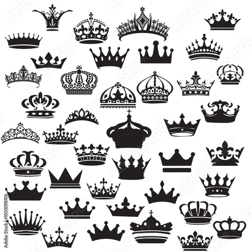 crown, silhouette, illustration, royalty, regal, tiara, black-and-white, decorative, graphic design, elegance, vector, icon, set, label, symbol, design, king, vintage, queen, royals, signs, heraldic, banner, collection, badge, emblem, decoration, luxury, imperial, jewellery, retro