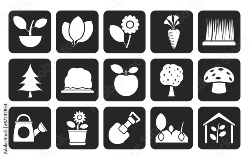 plant, gardening, vector, icon, set, nature, fruit, vegetable, leaf, garden, tool, buttons, menu, computer icon, web, site, signs, symbol, dirtied, ground, background, flower, flora, floral, carrot, grass, season, autumn, coniferous, pine, fir, spruce, bush, apple, tree, forest, wood, mushroom, food, agriculture, water can, pot, shovel, planting, cultivation, farming, sowing, silhouette