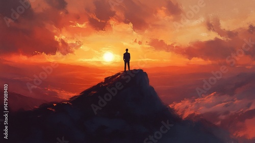 silhouette, figure, mountain, peak, sunset, sun, cloud, sky, red, orange, warm, view, standing, contemplation, perspective, top, journey, success, hope, inspiration, adventure, freedom, nature, calm, peaceful, moment, solitude, dramatic, colours, light, gold, horizon, landscape, exterior, epic, achievement, determination, vision, outlook, elevation, conquest, summit, path, future, triumph, strength, nirvana, serenity