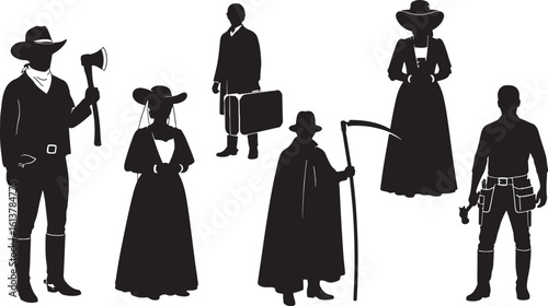 cowboy, silhouette, man, woman, cowboy hat, bandana, axe, scythe, cape, briefcase, suit, boot, tool belt, western, historical, vintage, character, people, group, collection, isolated, white background, black-and-white, graphic, illustration, drawing, cut-out, profession, occupation, iconic, symbolic, dramatic, mysterious, powerful, diverse, old west, folklore, fantasy, agriculture, death, labor