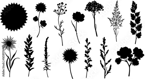 silhouette, floral, wildflower, plant, nature, diverse, black, botanical, design, artistic, composition, decorative, natural, foliage, garden, blossom, flora, floral pattern, creative, monochrome, elegant, minimalistic, classic
