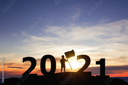 Silhouette freedom little boy standing on peaks with New year 2021. Education concept