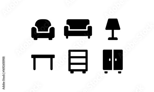 silhouette, furniture, icon, simple, living, room, office, symbol, chair, sofa, lamp, table, cabinet, drawer, interior, design, decor, minimalist, black, white, set, modern, clean, basic, collection, home, flat, graphic, signs, illustration