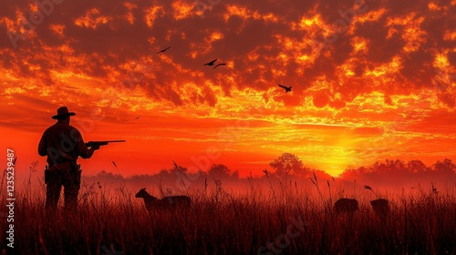 hunter, sheep, sunrise, sunset, silhouette, hunting, wildlife, cowboy, outdoors, farm, field, country, nature, animal, red sky, orange sky, wild, grass, mist, fog, outdoorsman, shooting, target, animal, rural, ranch, landscape, golden hour, wild west, morning, evening, horizon, rural scene, american west, western