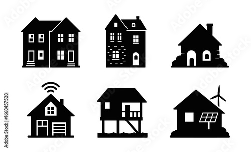 silhouette, house, architecture, icon, eco, technology, dwelling, outline, minimal, modern, building, home, design, shadow, residential, urban, rural, solar, wind, wireless, diverse, set, collection, traditional, chimney, roof, sustainability, renewable, smart, various, structure, facades, landscape