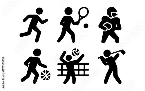 silhouette, sport, icon, activity, diverse, running, tennis, football, basketball, volleyball, golf, stick figure, minimal, design, graphic, hobby, fitness, team, leisure, symbol, recreation, set, collection, black, simple, athlete, motion, competition, popular, exercise, group, action, indoor