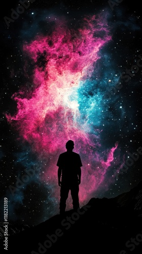 Silhouette Man Gazing at a Cosmic Nebula in the Night Sky
