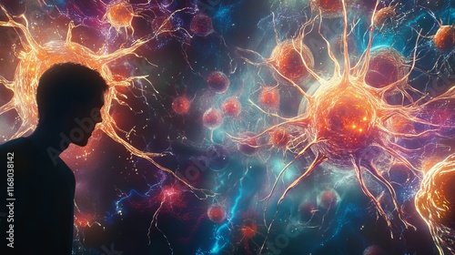 silhouette, person, nerve cell, mobile phone, network, connection, abstract, science, biology, medicine, health care, digital, art, illustration, vibrant, colourful, energy, glowing, bright, dark, background, texture, pattern, futuristic, cosmic, space, microscopic, intricate, complex, fiery