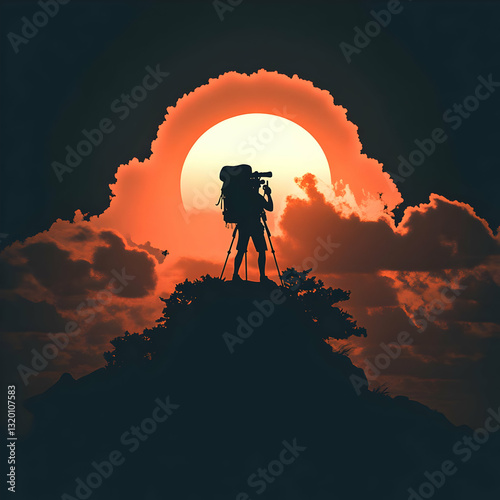 sunset, backpacker, photographer, silhouette, mountain, cloud, landscape, photo, travel, adventure, nature, dusk, digital artwork, illustration, artwork, scenic, view, climber, trekking, expedition, wilderness, horizon, sky, majestic, peaceful, serene, dramatic, vibrant, colours, red, orange, dark, shadow, exploration, summit, peak, mountain summit, high altitude, vista, panorama, idylli, serenity, calmness, solitude, escape, journey, discovery