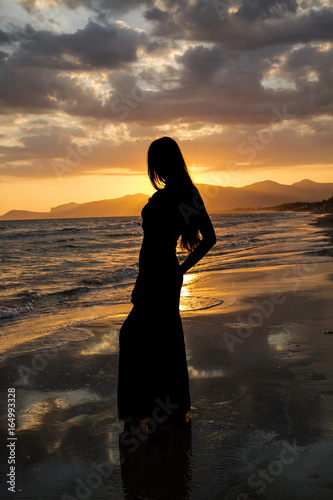 Silhouette of a beautiful woman on the background of the sea at sunset.