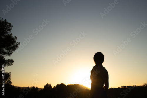 Silhouette of a beautiful young female on a summer walk in nature during golden hour in the spanish village El Papiol, near Barcelona, Spain