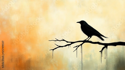 Silhouette of a black bird perched on a branch against a warm, abstract background.