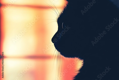 Silhouette of a black cat gazing out of a window at the sunset symbolizing quiet contemplation and mystery in a serene indoor setting with a warm glow