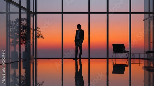 Silhouette of a Businessman Contemplating at Sunset in a Modern Office with Panoramic Views