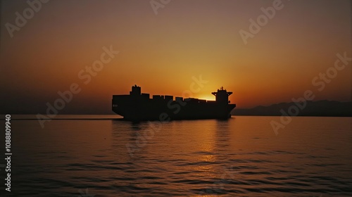 sunset, ocean, sea, ship, cargo, container, vessel, water, horizon, sun, dusk, twilight, transport, shipping, maritime, logistic, import, export, transportation, freight, global, trade, commerce, industry, business, silhouette, dark, evening, gold, light, sky, calm, peaceful, serene, solitude, travel, journey, adventure, scenic, view, beautiful, nature, landscape, background, image, photo