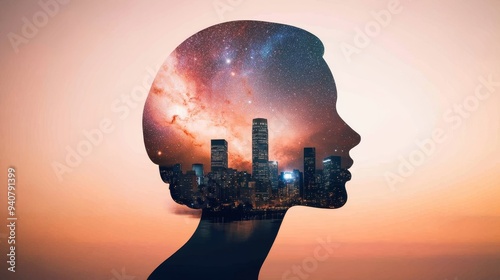 Silhouette of a city skyline blended with a glittering galaxy, star clusters, and swirling nebulae in a double exposure technique