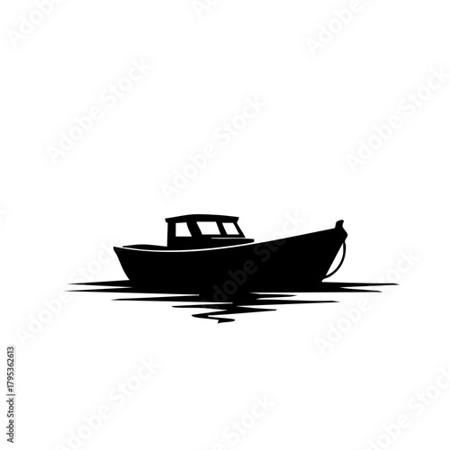 Silhouette of a classic fishing boat with cabin, floating on calm water