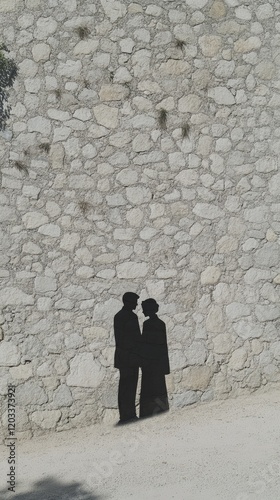 Silhouette of a Couple Against a Rustic Stone Wall in Bright Daylight Creating a Unique Shadow Art Effect