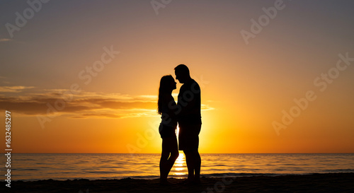 Silhouette of a couple embracing on a beach during a vibrant sunset with a golden sky view