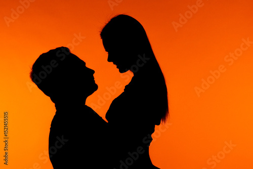Silhouette of a Couple in Romantic Embrace Against Orange Background