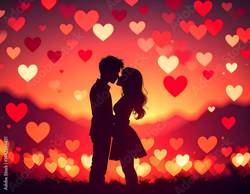 Silhouette of a couple kissing at sunset, surrounded by bokeh hearts. Romantic, loving, Valentine's Day concept.