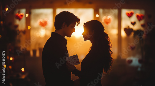 Silhouette of a couple sharing a romantic moment, holding a card in front of heart decorations during sunset