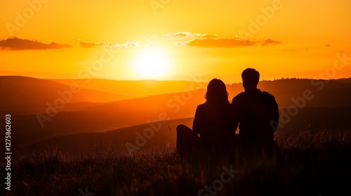 couple, silhouette, sunset, hill, nature, romance, landscape, love, orange, sky, calmness, togetherness, evening, horizon, outdoors, relaxation, scenic, view, connection, warmth, beauty, adventure, dream, peaceful, emotion, expression, exploration, serene, joy, intimacy, atmosphere, evocative, majestic, story, harmony, journey, dusk, sunlight, gold, vacation, escape, freedom, environment, memory, bliss, cuddle, affection