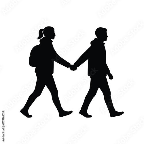 silhouette, couple, walking, holding, hand, together, love, human relationships, friendship, backpack, woman, man, people, isolated, white, background, black, person, togetherness, lifestyle, casual attire, happiness, enjoyment, leisure, portrait, studio, cut-out, graphic, art, design, travel, journey, adventure, exploration, romance, date, girlfriend, boyfriend, partner, companion, stroll, exercise, fitness, health, well-being