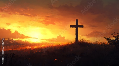 cross, sunset, sky, silhouette, cloud, horizon, field, grass, gold, light, warm, orange, red, nature, faith, hope, religion, spirituality, christianity, belief, worship, divine, god, prayer, peace, love, heaven, glory, serenity, landscape, heavenly, inspiration, calmness, calm, beauty