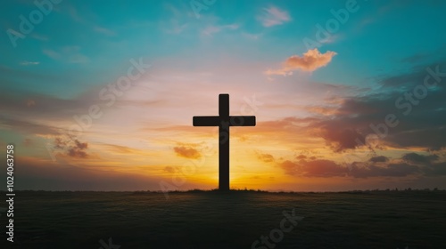 Silhouette of a cross against a vibrant sunrise sky with orange and blue hues, symbolizing faith and hope. Concept of spirituality, religion, peace, and new beginnings
