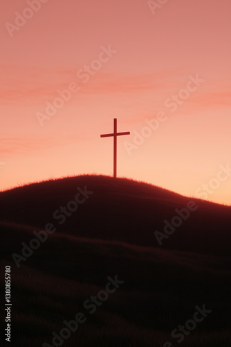 Silhouette of a cross on a grassy hill against a colorful sky at dusk, symbolizing faith and hope.