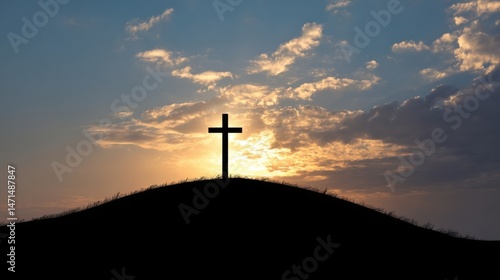 Silhouette of a cross standing atop a hill at sunset, with a vibrant orange and yellow sky filled with fluffy clouds. : Generative AI