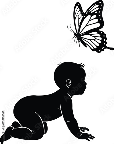 baby, silhouette, butterfly, crawling, infant, vector, nature, childhood, innocence, isolated, black, toddler, curiosity, growth, discovery, small child, flying insect, first steps, monarch butterfly, cute baby