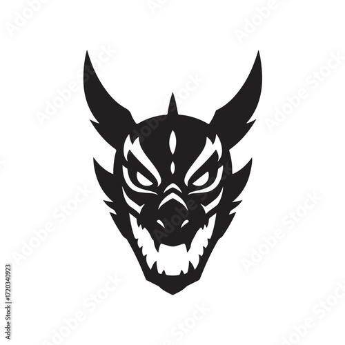 dragon, head, silhouette, horn, teeth, sharp, mythical, creature, fantasy, black, white, icon, logotype, graphic, fierce, monster, evil, beast, power, strength, aggressive, illustration, design, symbol, mascot, warrior, fear, dark, danger, reptile, winged, legendary, folklore, asian, tribal