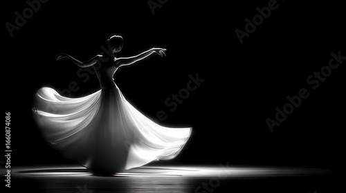 dancer, silhouette, female, woman, dancing, ballet, movement, graceful, elegant, performance, stage, dark, black, white, light, dramatic, art, artistic, creative, motion, spin, twirl, fabric, dress, flowing, aethereal, dreamlike, spotlight, choreography, expression, beauty, passion, emotion, modern, contemporary, solitary, individual, performer, athletic, energy, abstract, artistry, performing arts, dance studio, theatre, gracefulness, fluid
